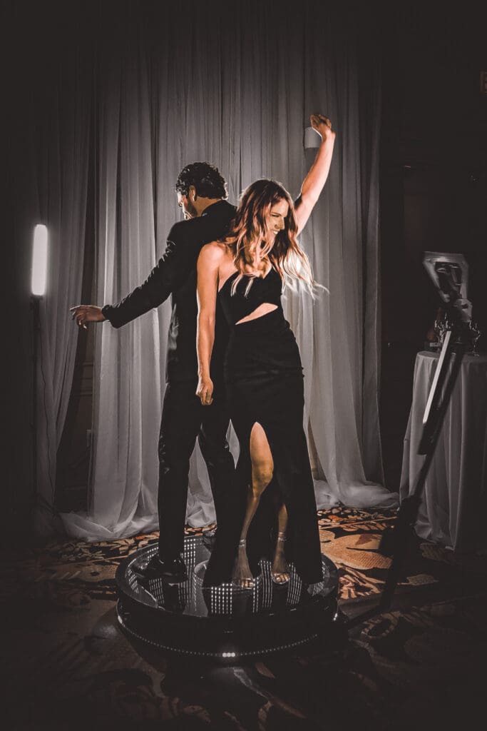 A 360 degree video booth features a platform where guests stand while a rotating camera arm captures video from every angle. The footage is edited into slow-motion or music-enhanced clips that can be instantly shared.